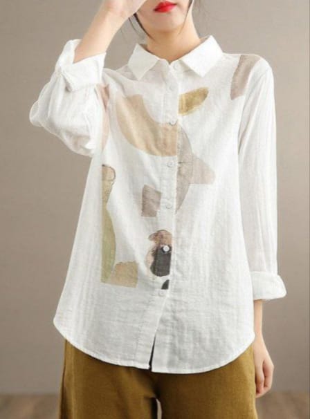 Elevate your everyday wardrobe with our abstract print linen-blend shirt for women. Crafted from a lightweight and breathable cotton-linen blend, this white shirt features artistic brushstroke-style abstract prints in earthy tones—perfect for those who love a touch of minimalist flair. Whether you're heading out for a vacation, a coffee date, or just lounging in style, this minimal white printed shirt for women keeps you cool and effortlessly elegant.