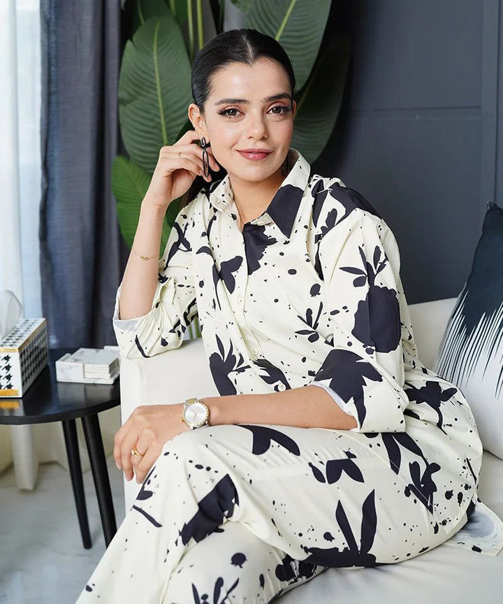- Coordinating Printed pants with an elastic waistband for a comfortable fit.