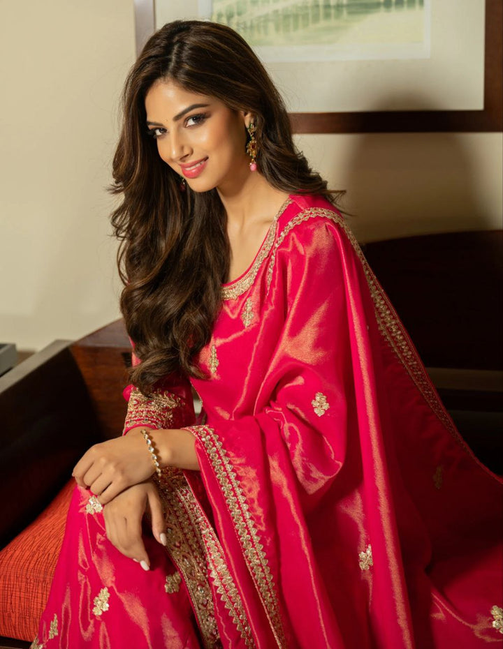Pair this stunning red silk suit with gold jhumkas, bangles, and embroidered juttis for a flawless festive look. Keep your makeup subtle with bold lips to let the outfit steal the spotlight. 💃✨
