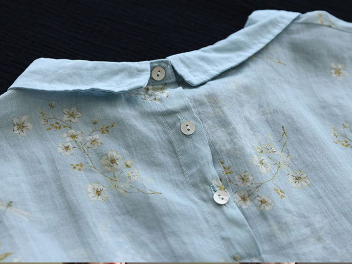 Stay effortlessly chic with this soft blue floral cotton-linen top, perfect for warm days and casual outings. Featuring delicate floral prints, a Peter Pan collar, and half sleeves, this blouse brings a touch of vintage charm and breathable comfort to your everyday look. Pair it with your favorite trousers, skirts, or shorts for an easy yet elegant vibe.
