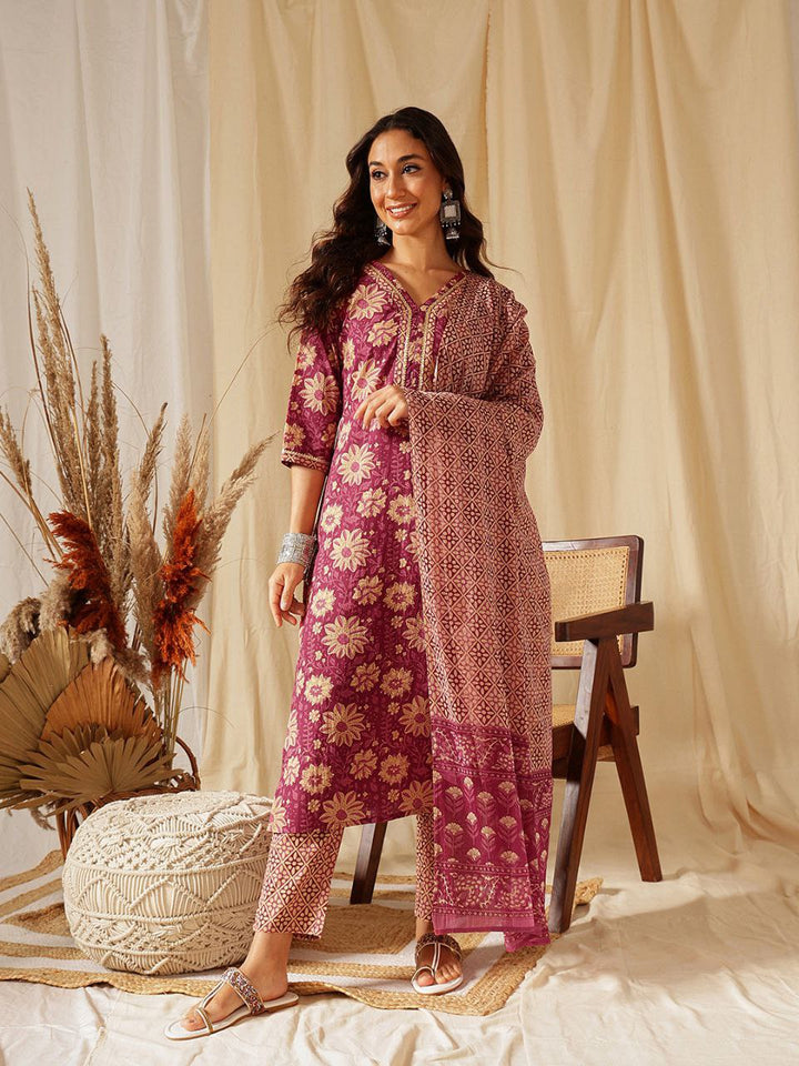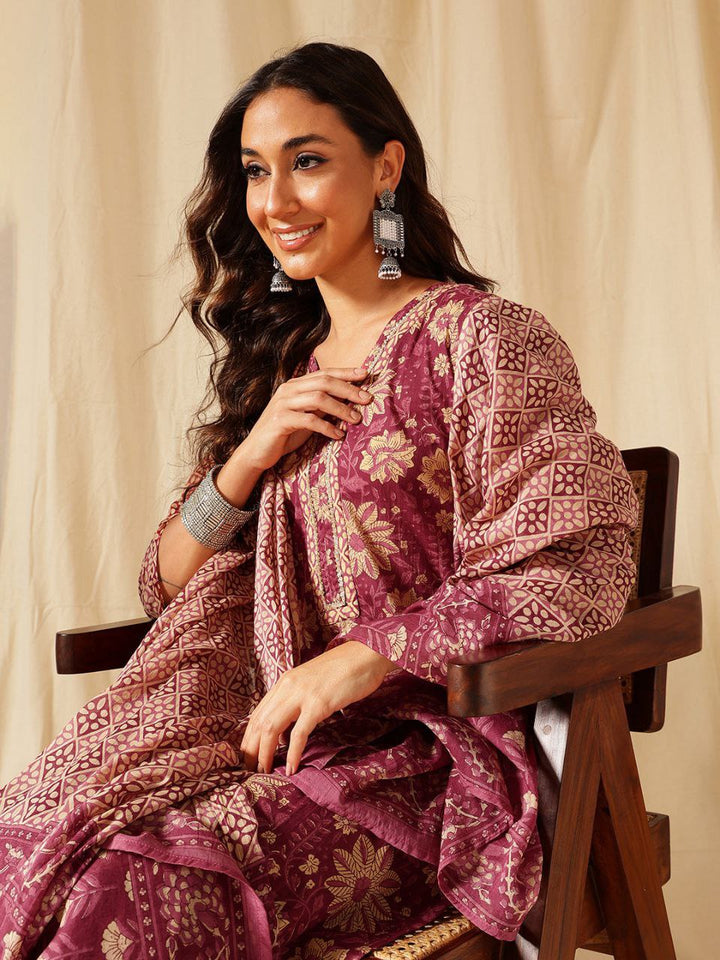 Embrace the beauty of tradition with this exquisite maroon floral suit set, featuring delicate gold prints that exude grace and sophistication. Crafted from lightweight and breathable cotton, this ensemble ensures comfort while keeping you effortlessly stylish. The three-piece set includes a beautifully embroidered kurta, coordinated straight-fit pants, and a chic printed dupatta to complete the look.