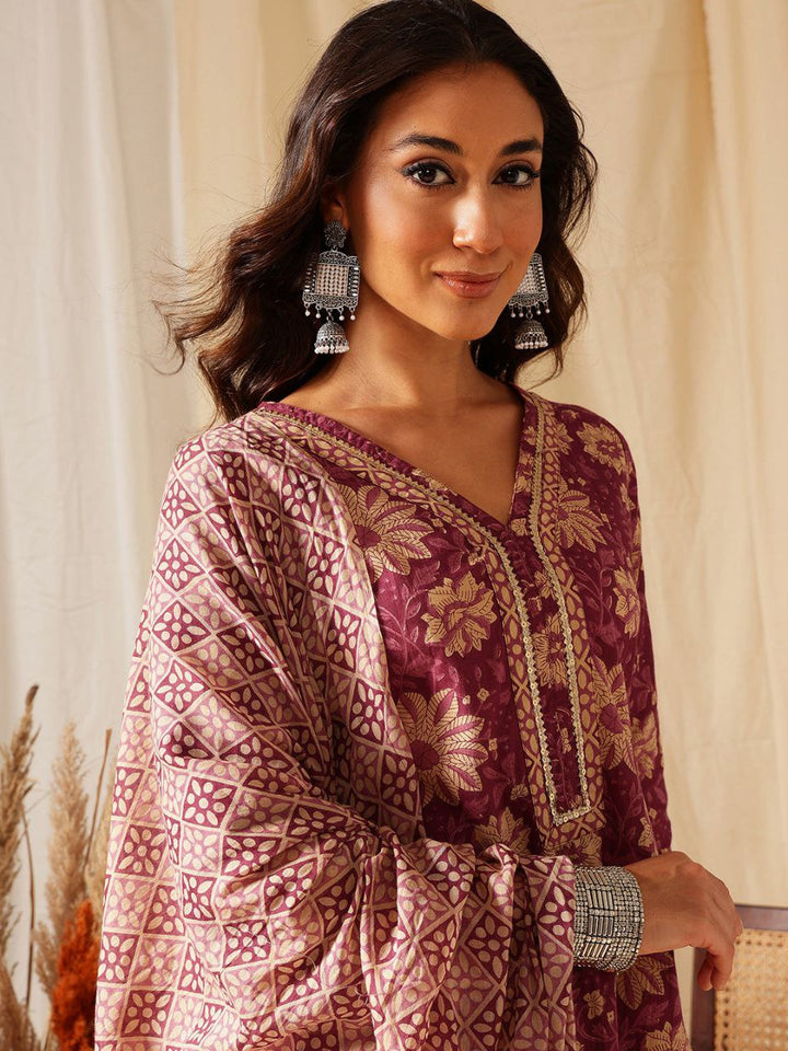🌸 Radiant Maroon & Gold Floral Suit Set
